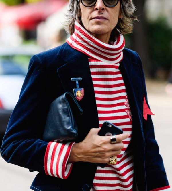 Travailler les rayures en duo (voir ici et là). Oser la fausse fourrure sobrement rayée (à mixer avec un look utilitaire) (voir ici). Porter ses robes-pulls marinière sur un jean ou un pantalon flare (voir ici). Jouer avec les imprimés tout en respectant les harmonies de couleurs (voir ici). Télescoper la douceur romantique d'un ample jupon blanc avec la rugosité d'un large pull marinière (voir ici). User et abuser du trio léopard/blazer bleu marine/rayures marinières (voir ici). Se rappeler que les rayures marinières apprécient tout particulièrement la compagnie du daim fauve (voir ici). Contrebalancer la légèreté d'une marinière au coton distendu en enfilant une épaisse peau lainée (voir ici). S'essayer au turban (ou pas) (voir ici). Glisser une sobre marinière sous un blazer masculin (voir ici). Marier régulièrement carreaux, rayures horizontales et tacheté léopard (voir ici). Miser sur la subtilité en ne laissant apparaître qu'une toute petite partie de la marinière (voir ici). Travailler en duo marinière souple et grosse maille (voir ici). Oser la version "robe pull longue" de la marinière de Coco Chanel (voir ici). Profiter de leur impact graphique pour faire des tops à rayures horizontales les meilleurs alliés des gilets et autres pièces sans manches (voir ici). Penser à dynamiser les rayures bleu et blanc au contact d'un éclat argenté (voir ici). Garder à l'esprit que l'ADN utilitaire de la marinière se marie fort bien à la nature festive des sequins (voir ici).