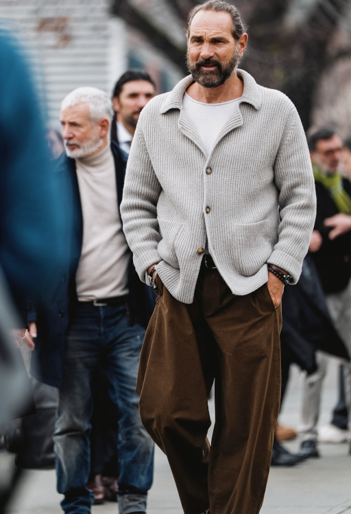 Marier l'ampleur rugueuse d'un pantalon marron avec la douceur d'un gilet côtelé gris clair (voir ici).